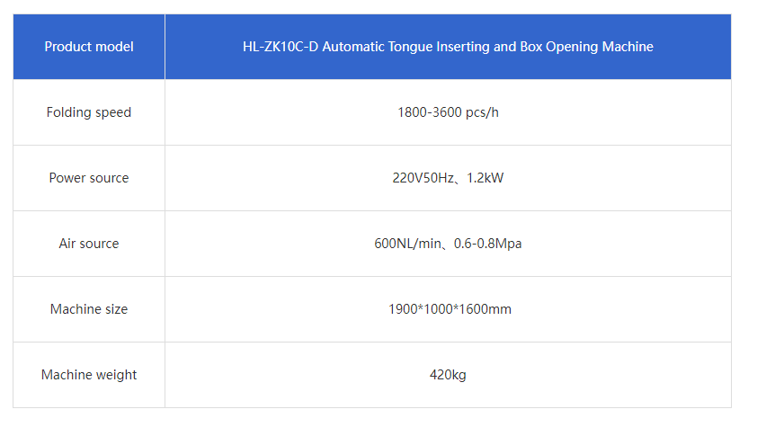 This machine has a box rack, on which a stack of boxes can be placed; it automatically takes out boxes, opens boxes, sprays glue on one side, and outputs semi-finished products, which is convenient for manual boxing and improves production capacity.